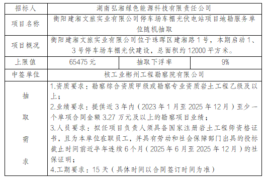 衡陽(yáng)建湘文旅實(shí)業(yè)有限公司停車(chē)場(chǎng)車(chē)棚光伏電站項(xiàng)目勘察服務(wù)隨機(jī)抽取結(jié)果公示